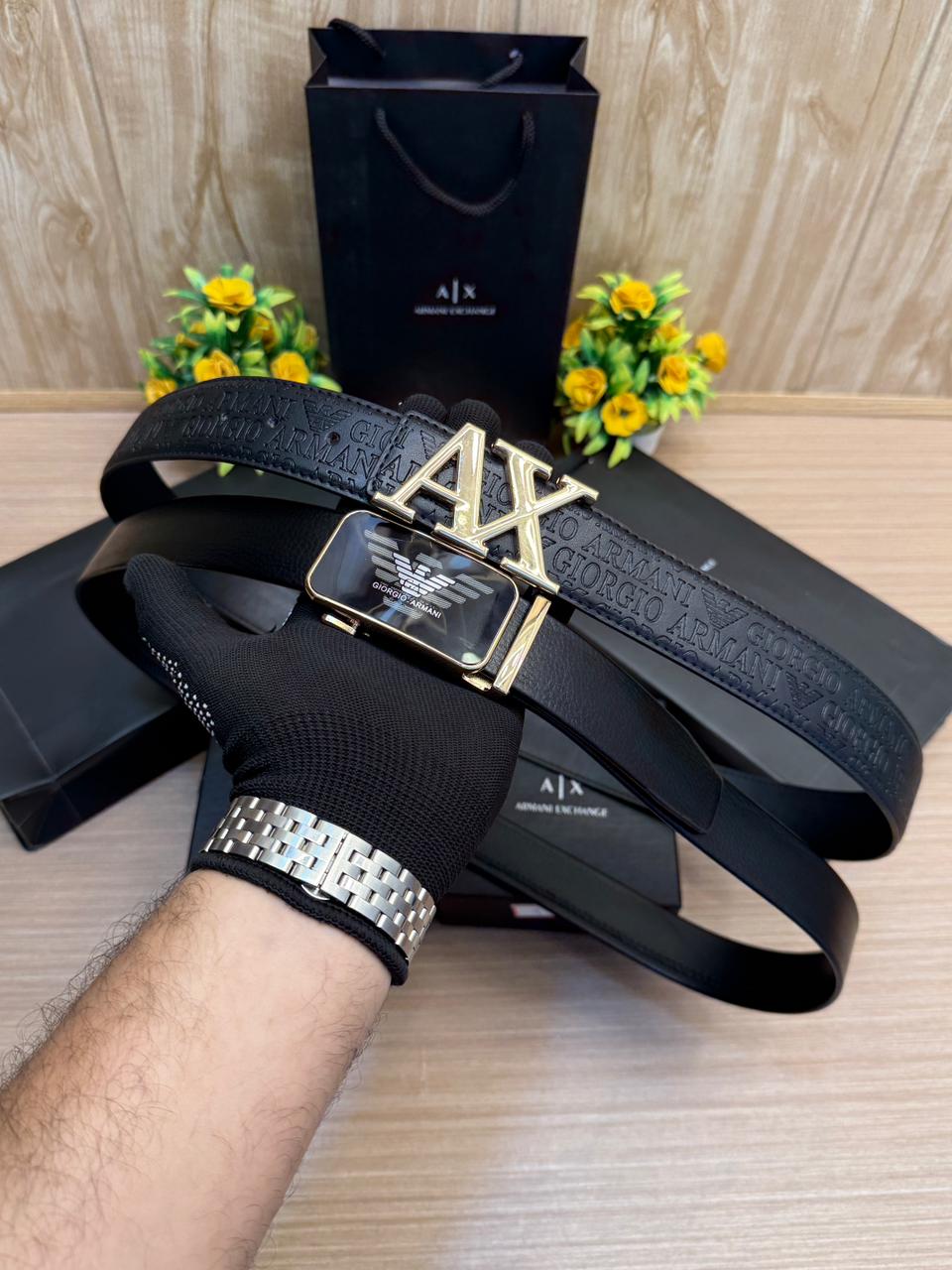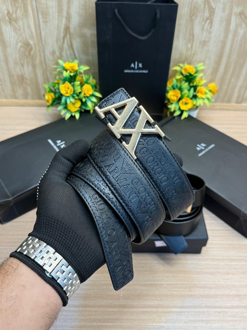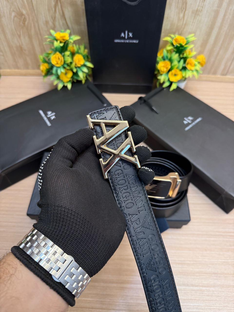 MODEL:- AIX Gold & Black Embossed 2 pcs Monogram Strip Belt with Brand Box & Carry Bag