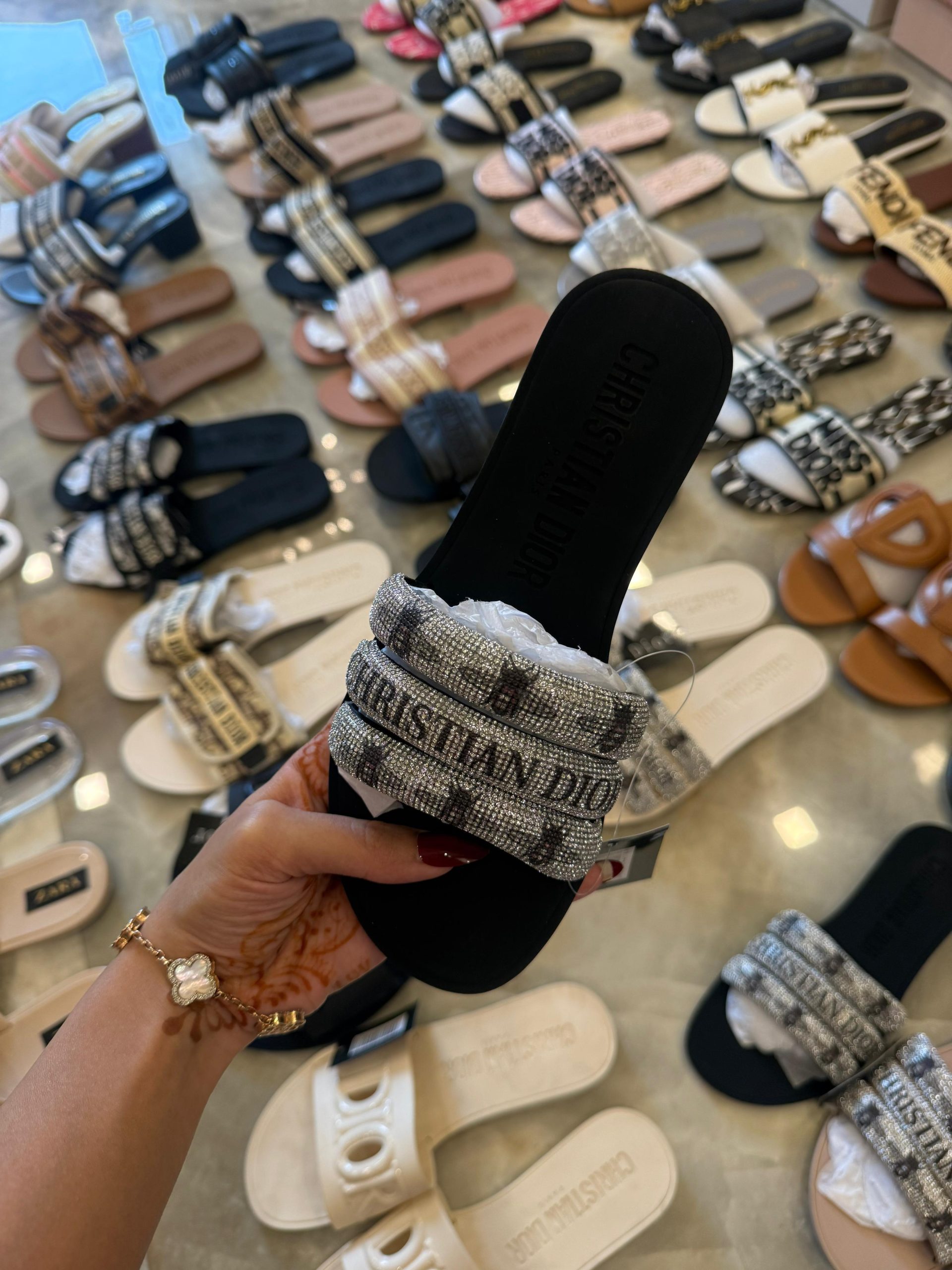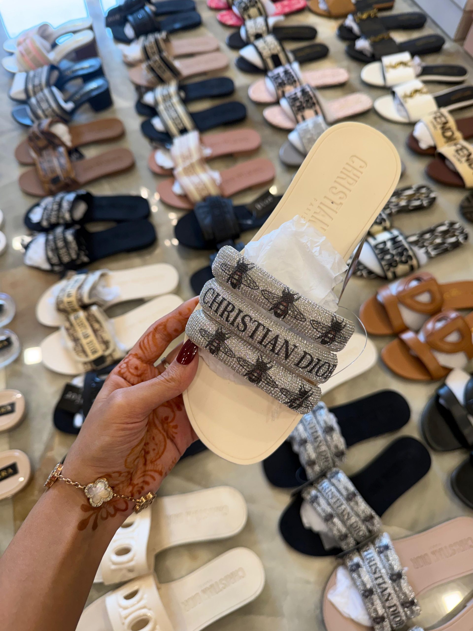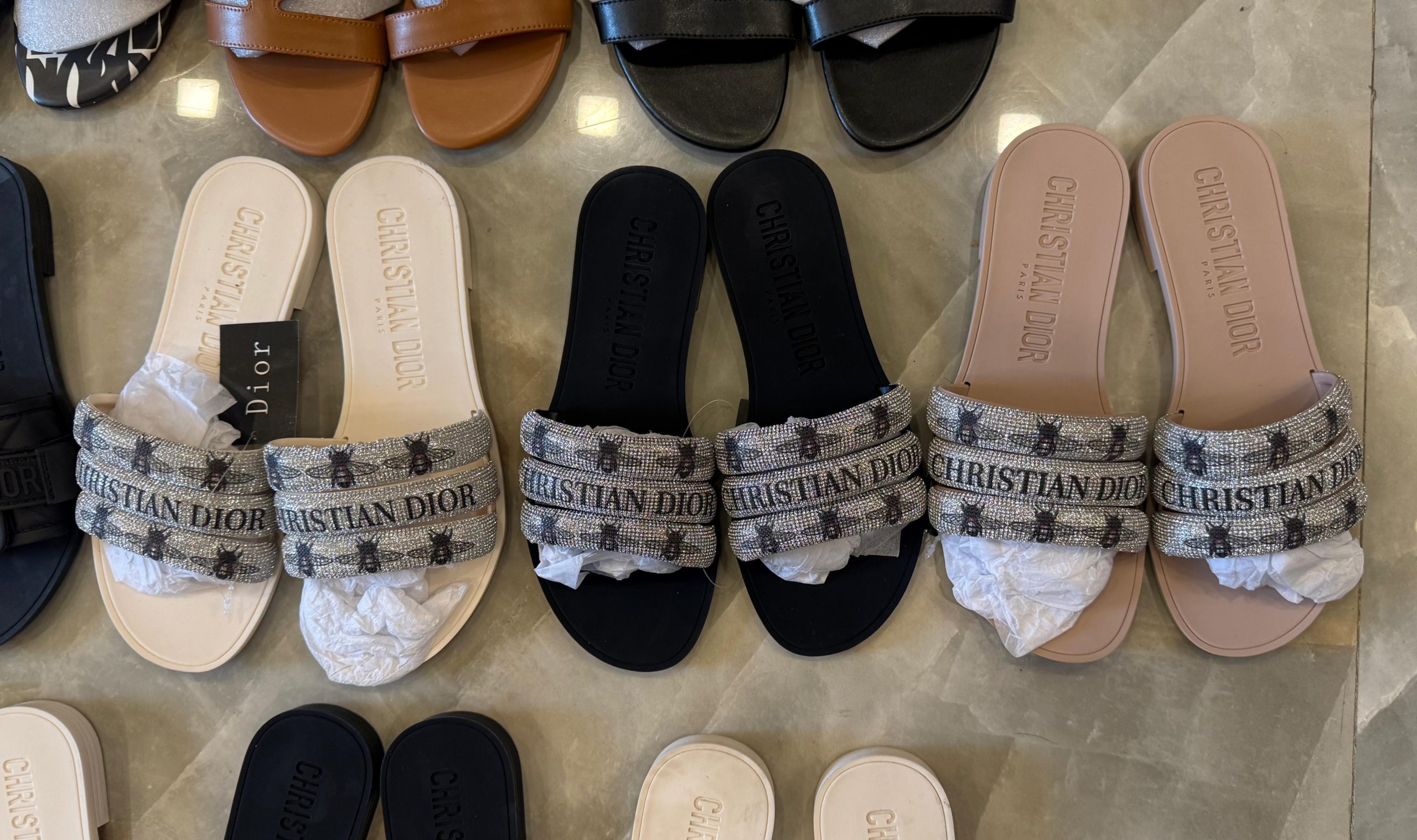 CHRISTIAEN DIORE BEE STUDDED FLATS – BLACK, WHITE AND BEIGE
