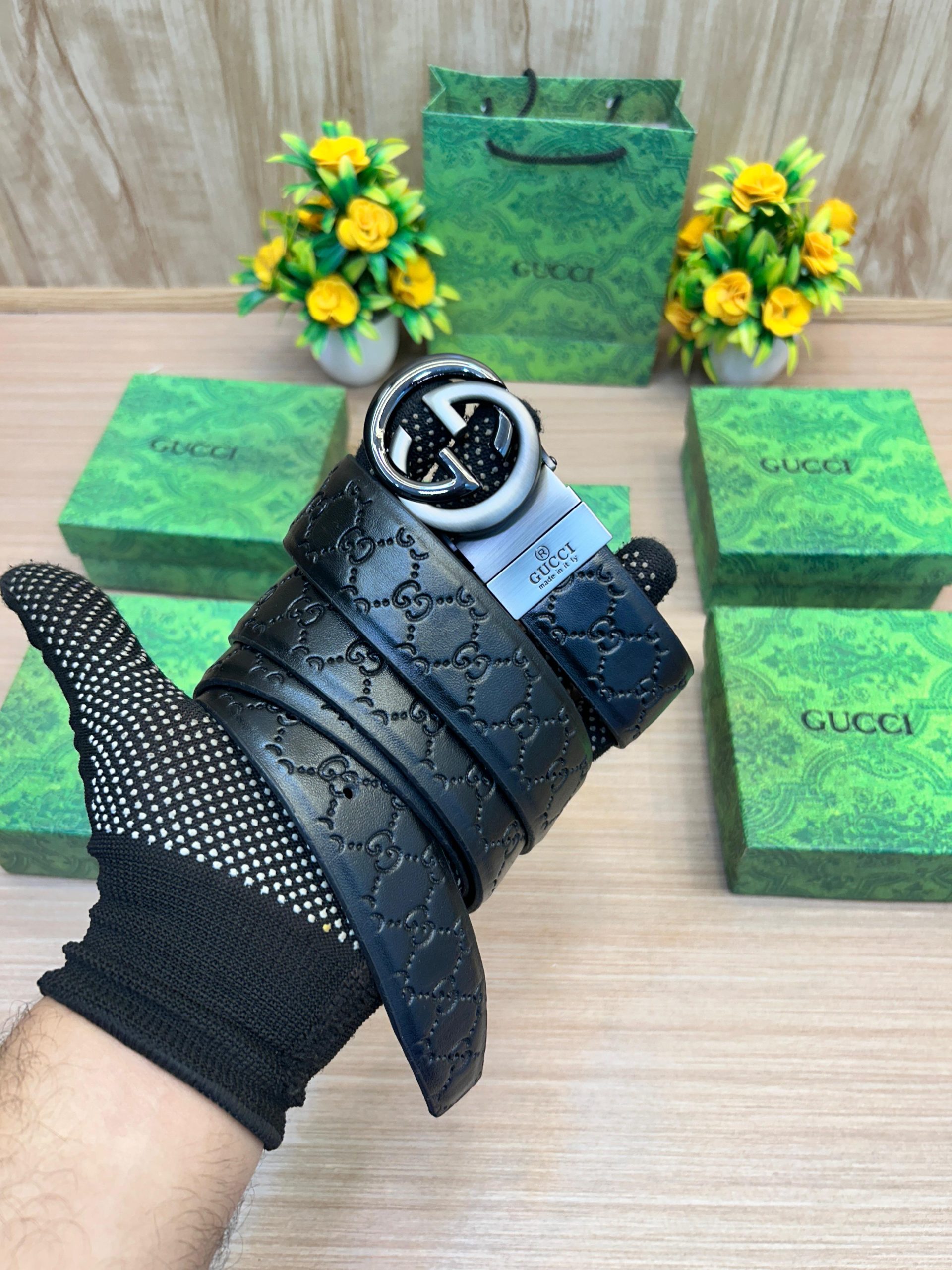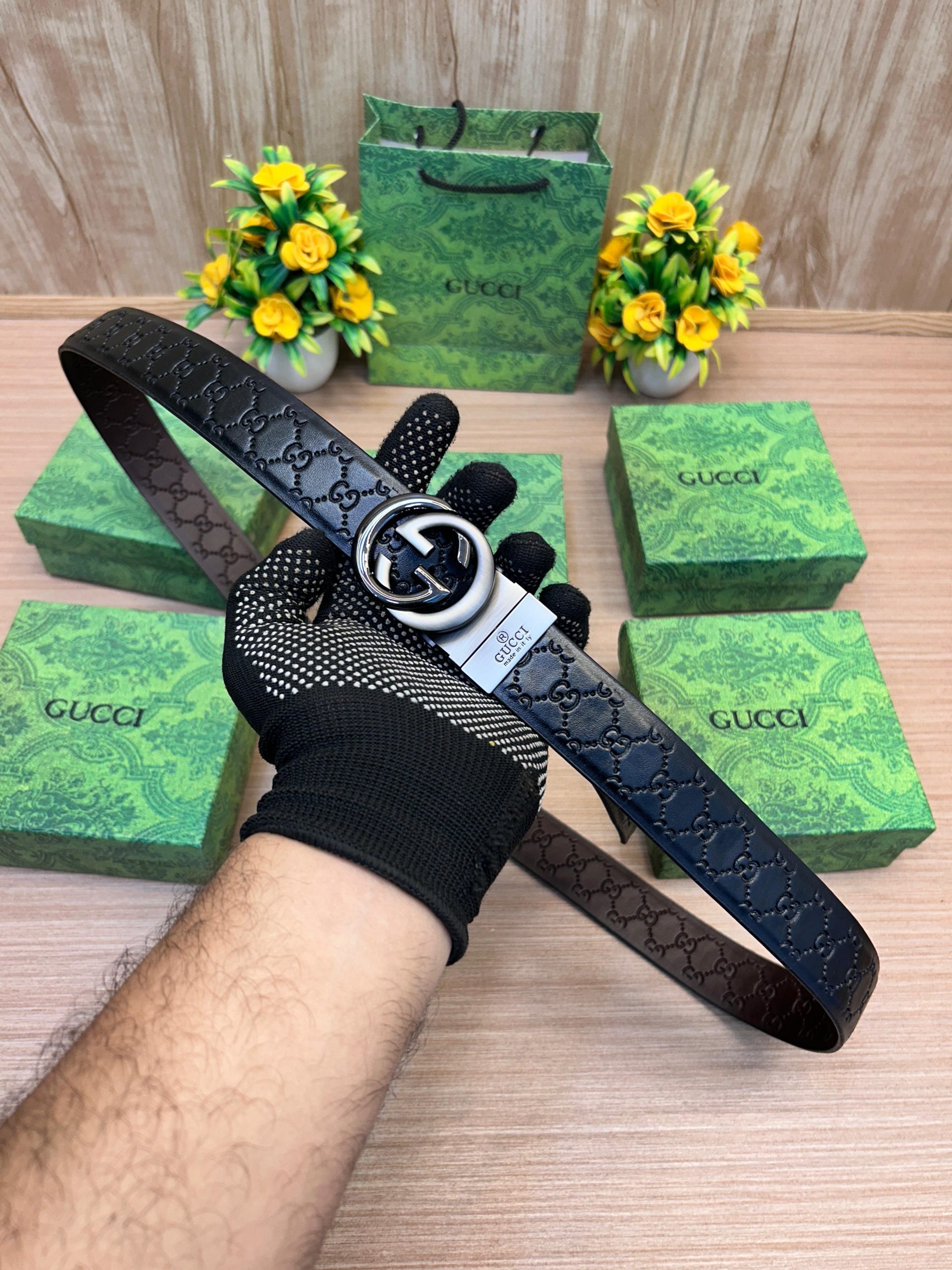 GUCCII GG Black/Brown Embossed Strip Belt