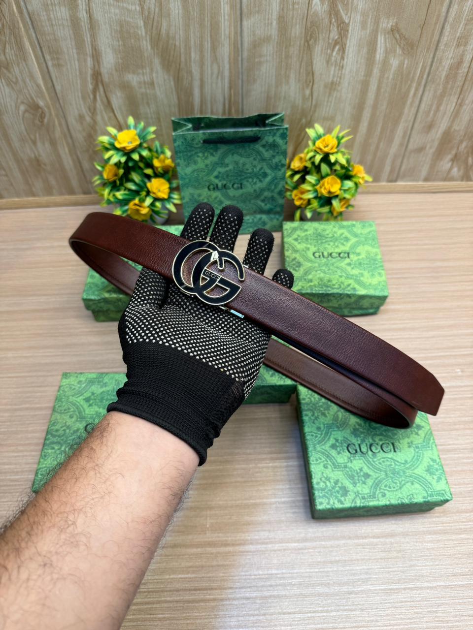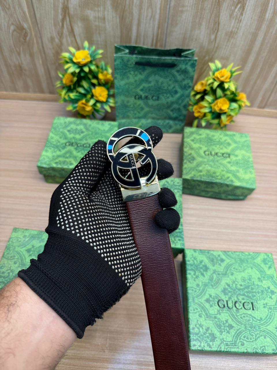 ‘- GUCCIS GG Gold / Brown Premium Quality Auto Grip Lock Buckle Belt with Brand Box & Carry Bag