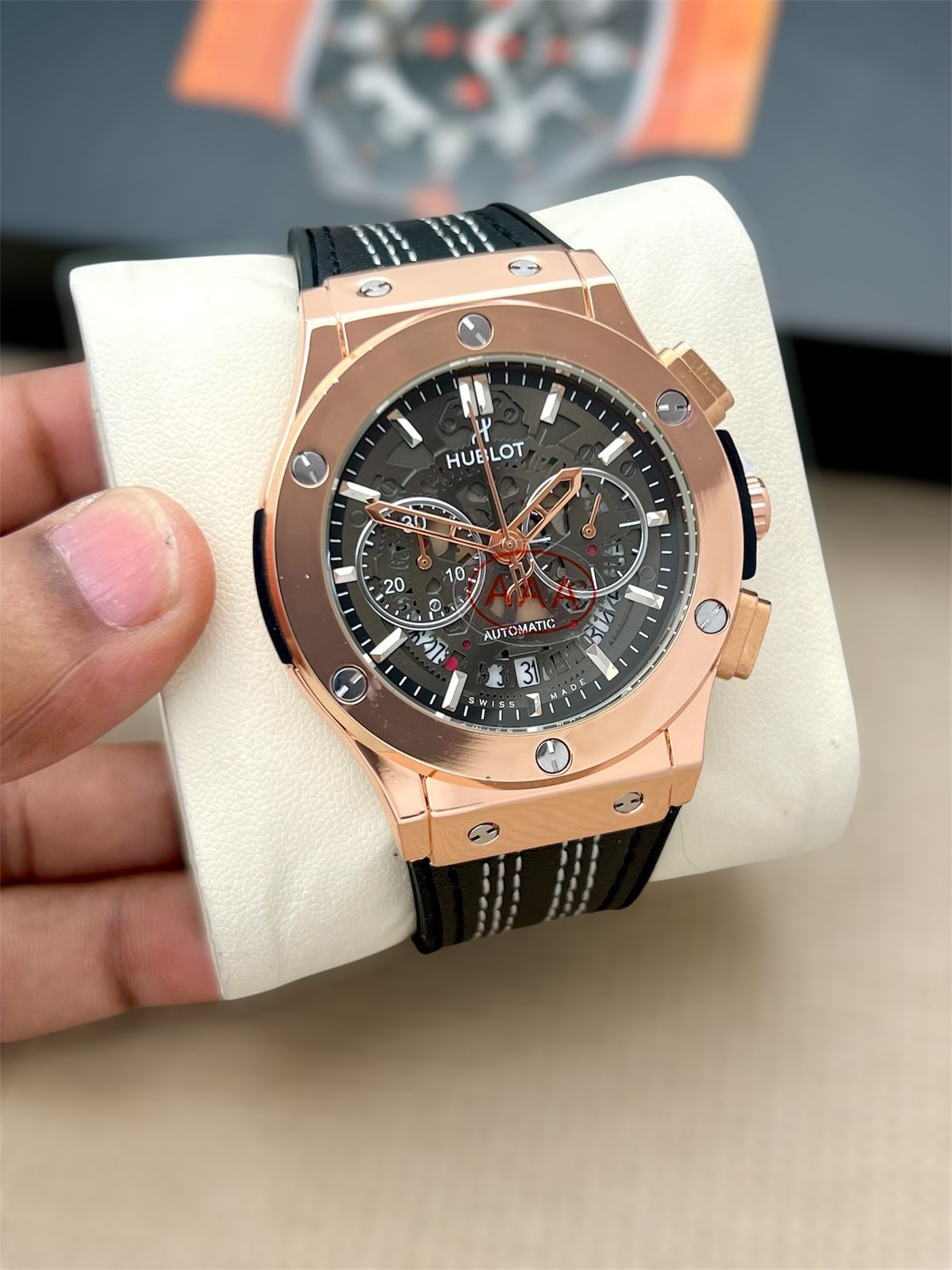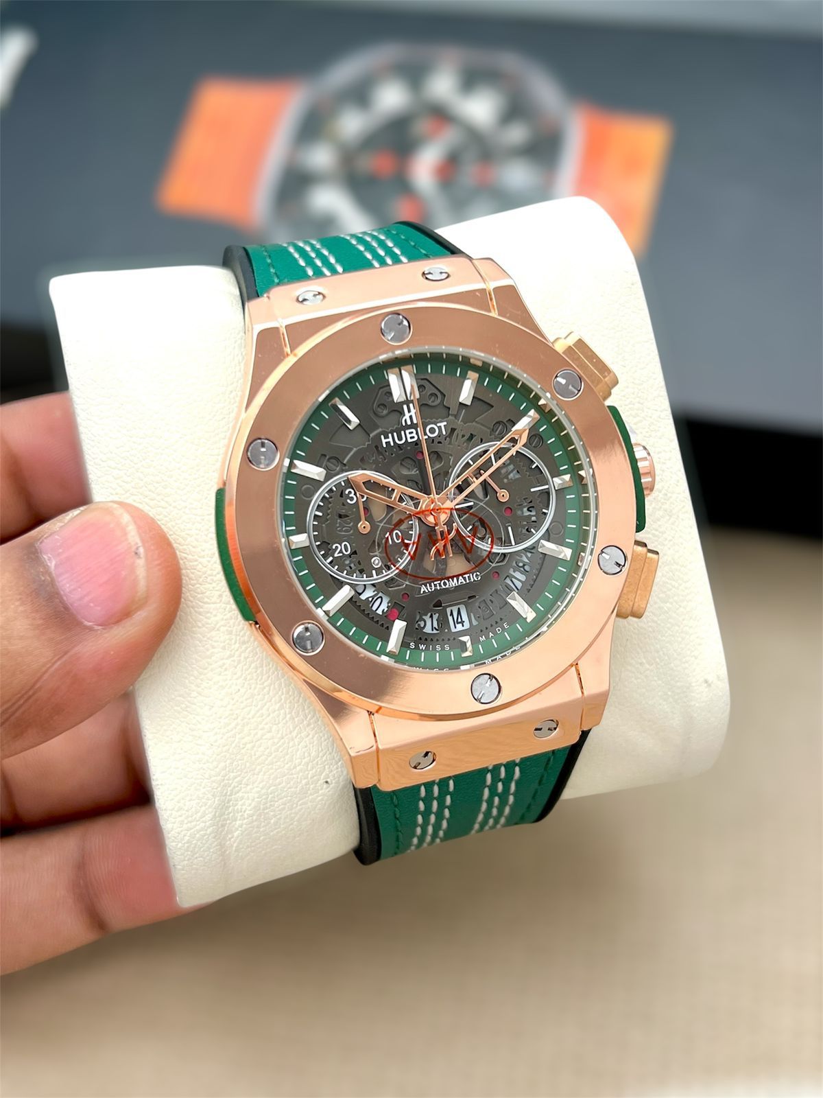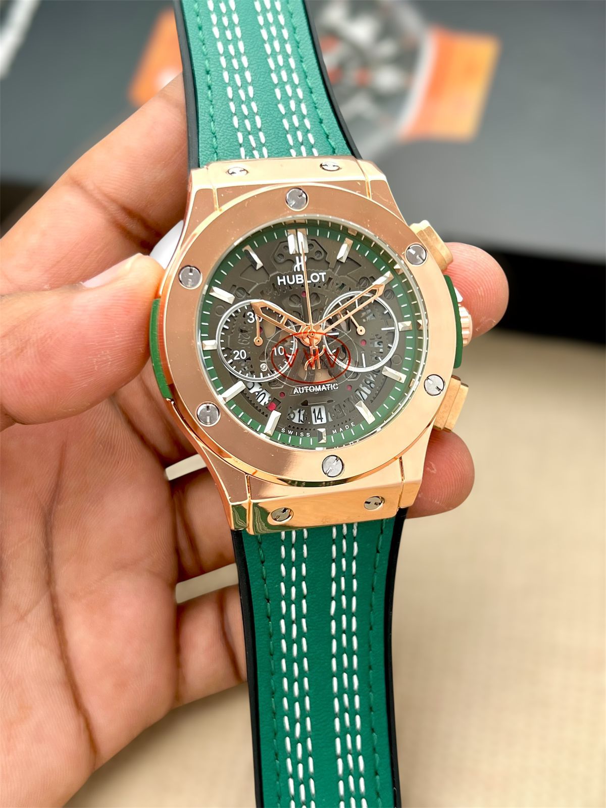 * ?Bold blck green blue leather + Rubber strap with white stitching