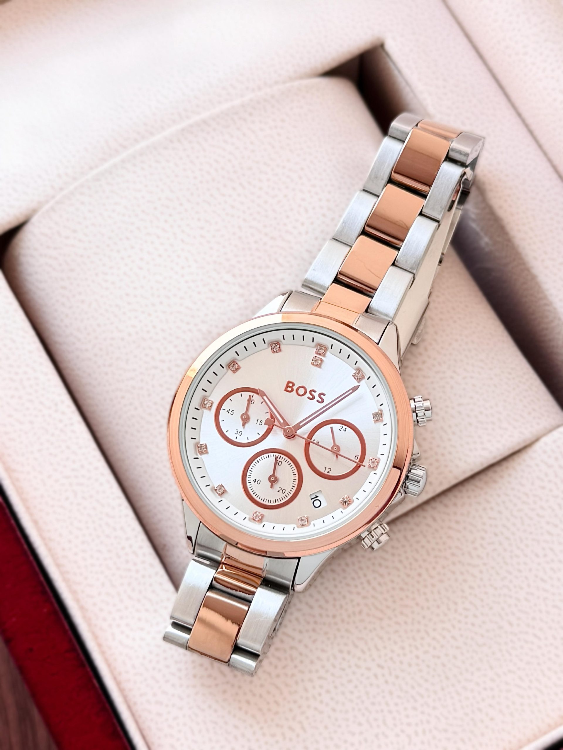 – Case Material: Stainless Steel (Rose Gold Tone Bezel)