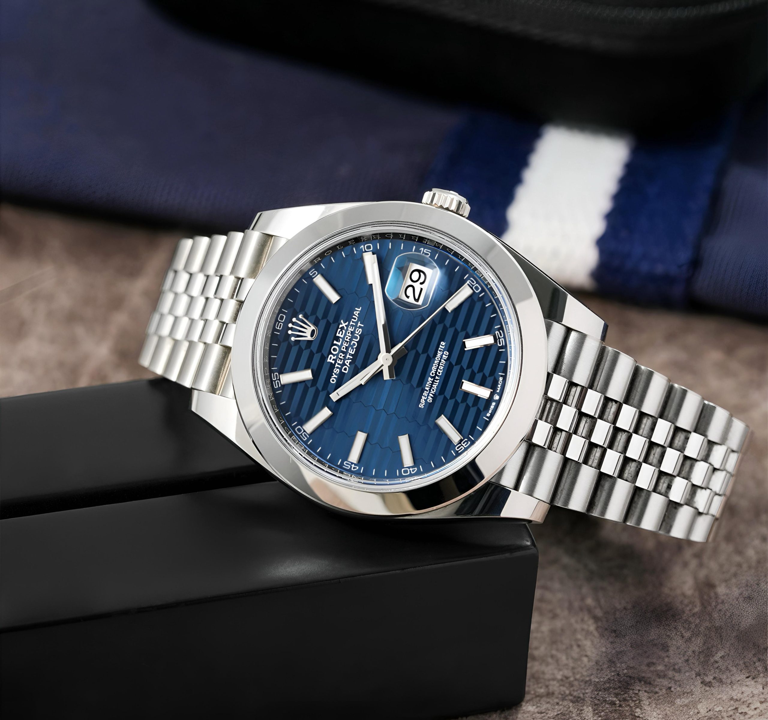 – 12 hour timing with trending blue motif face dial with silver elements